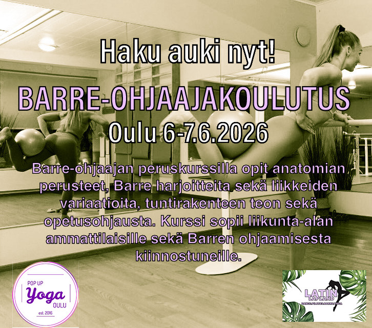 Haluatko kouluttautua Barre-ohjaajaksi! Tämä kurssi sopii sinulle, joka haluat syventää Barre-harjoitteluasi tuntien ohjaamista kohti tai laajentaa esimerkiksi joogaopettajan tai liikunnanohjaajan osaamistasi. Voit tulla kurssille myös ilman erillistä tavoitetta, syventämään omaa osaamista. Barre-ohjaaja peruskurssilla opit anatomian perusteet, Barre harjoitteita ja liikkeiden variaatiot, tuntirakenteen teon sekä ohjausopetusta, musiikin ja äänenkäyttöä. Syvennymme ryhmänohjauksessa tarvittaviin taitoihin sekä siihen, millä tavoin sinusta kuoriutuu hyvä tuntienohjaaja! Koulutuksen jälkeen voit aloittaa oman barre-ohjaajan polkusi, sinun sopivalla tavalla ja tahdilla. Koulutus sisältää manuaalin, koulutusviikonlopun harjoituksineen sekä Barre-ohjaajatodistuksen suoritettuasi kaikki koulutukseen liittyvät harjoitteet. Koulutus ei sisällä ruokailuja tai majoitusta.